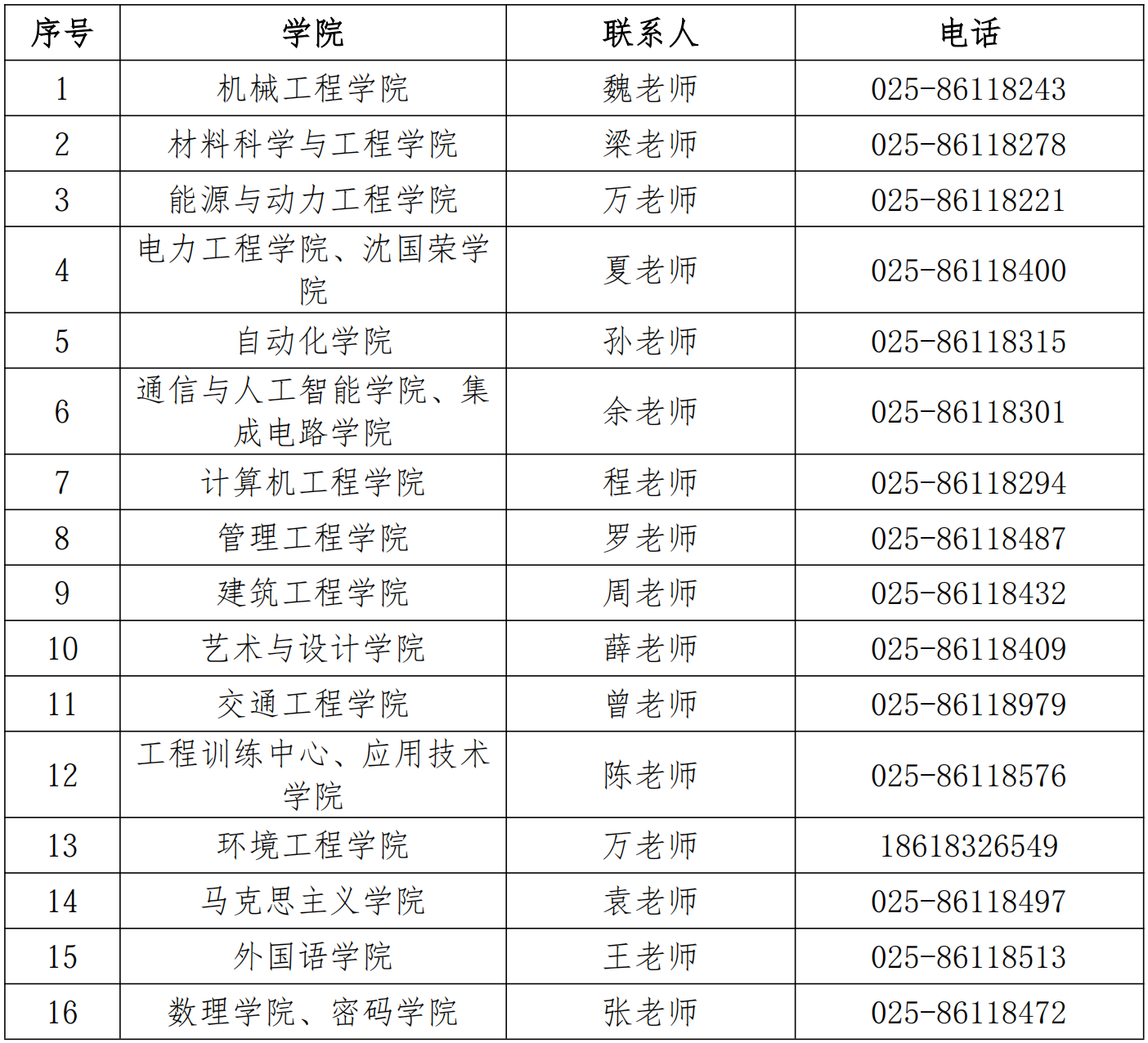 6、研究生院招生办公室联系方式:王老师,025-86118105,各学院联系方式见下表: