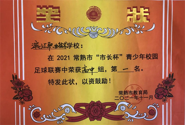 2021年12月10日,常熟市“市长杯”青少年校园足球比赛正式落下帷幕。常熟市滨江职业技术学校男子足球队以四战四胜的成绩,一举夺得高中组总冠军,取得了苏州市“市长杯”校园足球的比赛资格。