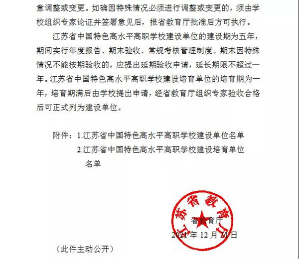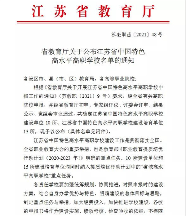 中国特色高水平高职学校和专业建设计划是中国共产党中央委员会和中华人民共和国国务院为建设一批引领改革、支撑发展、中国特色、世界水平的高等职业学校和骨干专业(群)的重大决策建设工程,是推进中国教育现代化的重要决策,旨在打造技术技能人才培养高地和技术技能创新服务平台,引领职业教育服务国家战略、融入区域发展、促进产业升级。江苏省中国特色高水平高职学校建设工作是贯彻落实全国、全省职业教育大会的重要举措,也是教育部《职业教育提质培优行动计划(2020-2023年)》明确的重点任务。本次遴选经过江苏省教育厅初审、评前公示、专家组评议、评委会评审四个环节,共评出10所省高水平高职学校建设单位和15所省高水平高职学校建设培育单位,并将其同时纳入提质培优行动计划中的“省域高水平高职学校”重点任务。