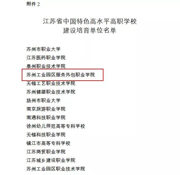 2021年12月31日,江苏省教育厅发布了《关于公布江苏省中国特色高水平高职学校名单的通知》(苏教职函〔2021〕48号),苏州工业园区服务外包职业学院成功入选江苏省高水平高职学校建设培育单位。
