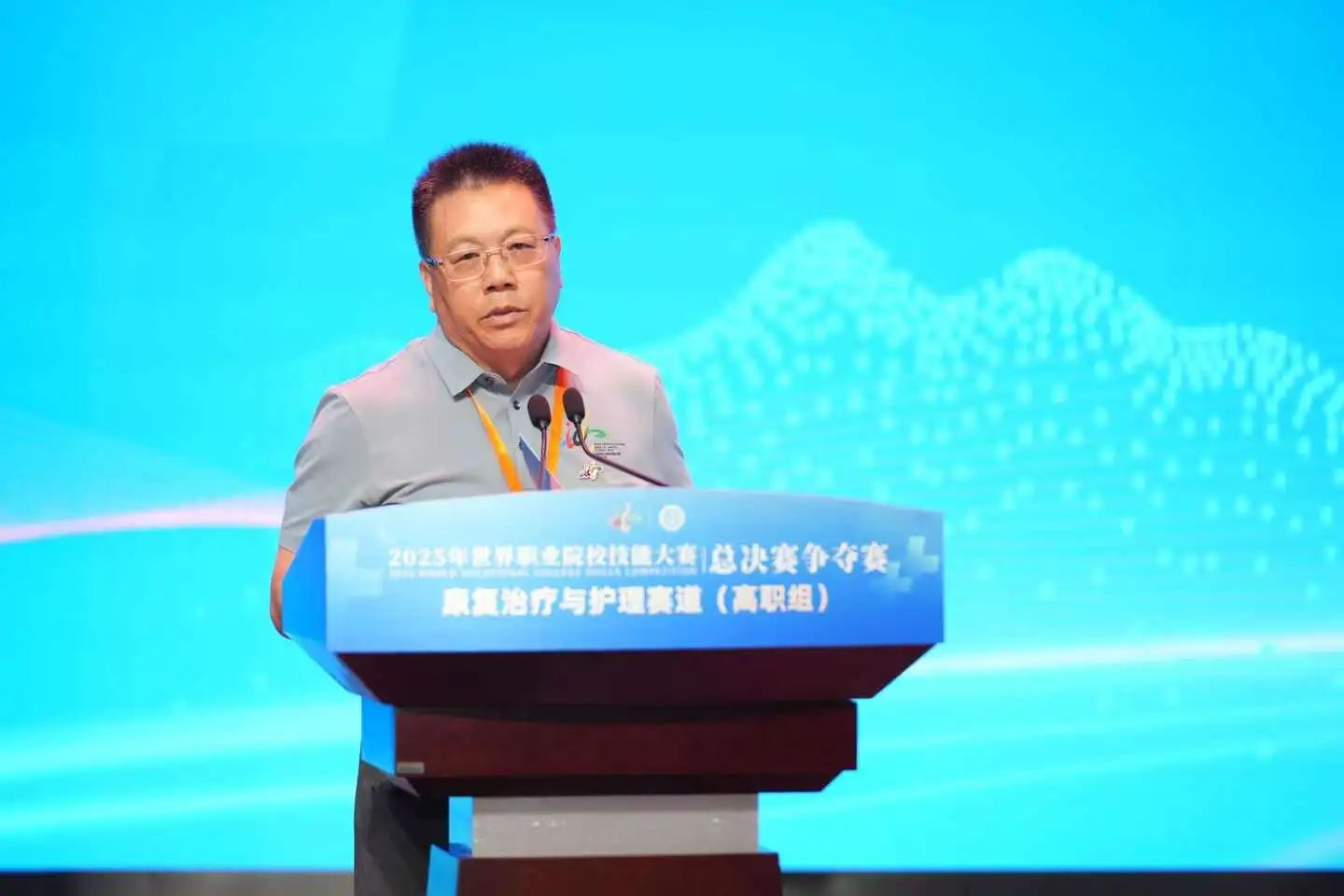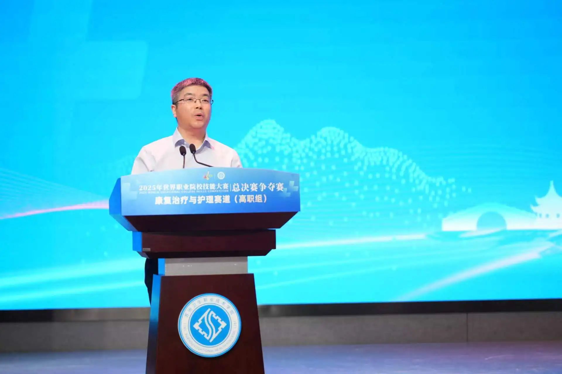 王文海副主任在讲话中强调,世界职业院校技能大赛是中国职教领域的重大制度创新。他指出,今年医药卫生类赛道进行了整合升级,“康复治疗与护理赛道”首次实现多技能模块融合,全面考查临床思维与跨学科协作能力。他对本届赛事提出三点希望:一是希望各院校以大赛为契机深化教育教学改革,培养兼具“临床技能+人文素养+数字能力”的复合型人才;二是希望参赛选手以工匠精神锤炼过硬本领,要展现精准的操作技能,更要践行“患者至上”的职业操守;三是希望专家裁判以专业执裁确保公平公正,让大赛成为展示职业教育风采的“国际窗口”。