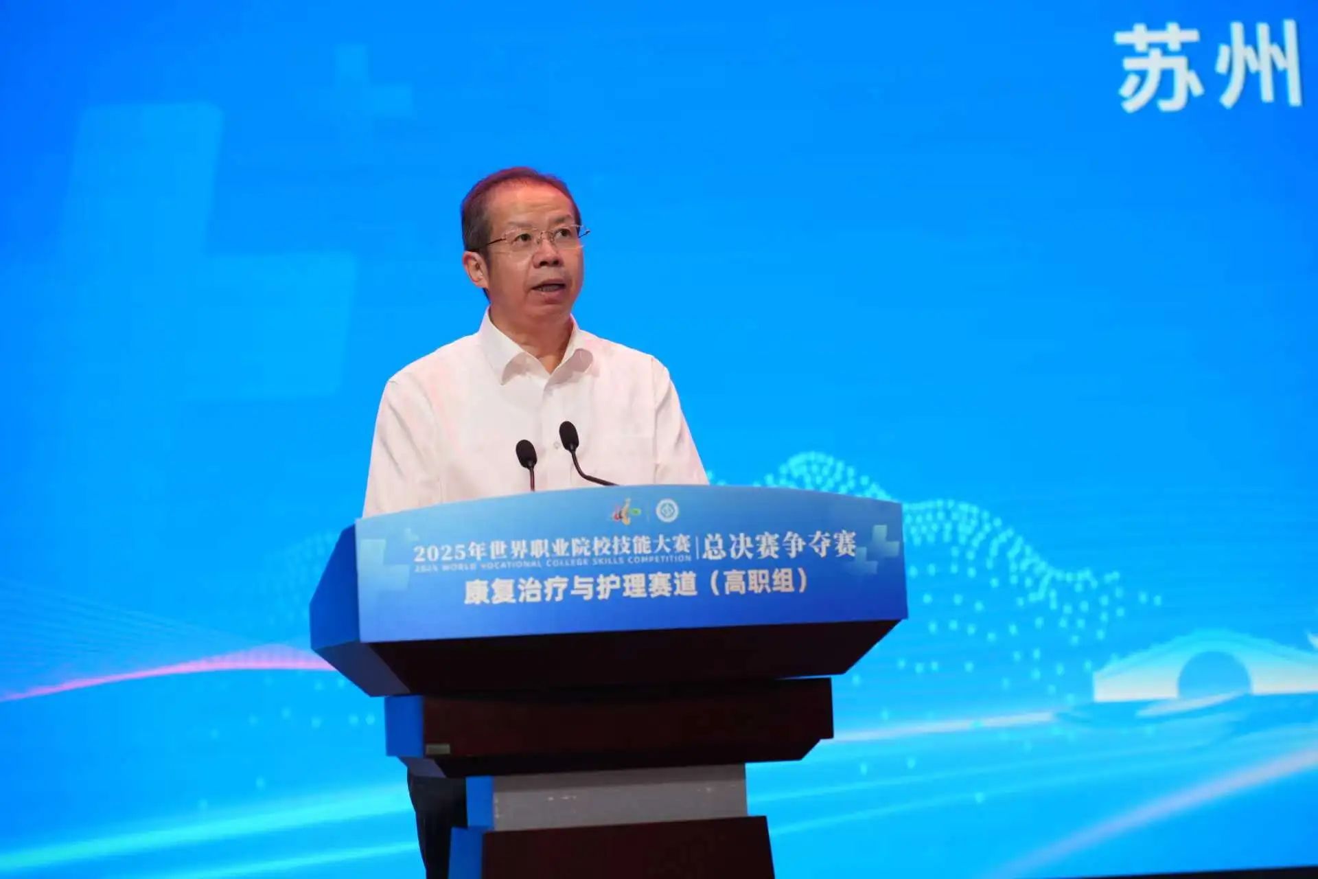 吴旭翔副秘书长在讲话中指出,苏州高度关注并全力推进职业教育发展,着力构建规模宏大、体系健全的职教网络,大力促进职业教育与区域产业深度融合,精心打造了一批特色鲜明、优势凸显的品牌专业集群,持续为苏州乃至长三角区域经济社会高质量发展输送高素质技术技能人才。此次世界职业院校技能大赛总决赛争夺赛康复治疗与护理赛道(高职组)落户苏州,既是集中展示康复治疗与护理职业教育成果的精彩舞台,也为全国康复治疗与护理领域的专家们提供了互鉴互学、共同提高的宝贵机会。他表示,未来,苏州将持续深化“校院共育、产教互融”机制,携手产业园区、医疗机构及企业力量,共建现代医教体系,着力培养复合型健康守护者,为苏州打造“中国药谷”与“健康名城”提供坚实人才基石,全力推动职业教育高质量发展。