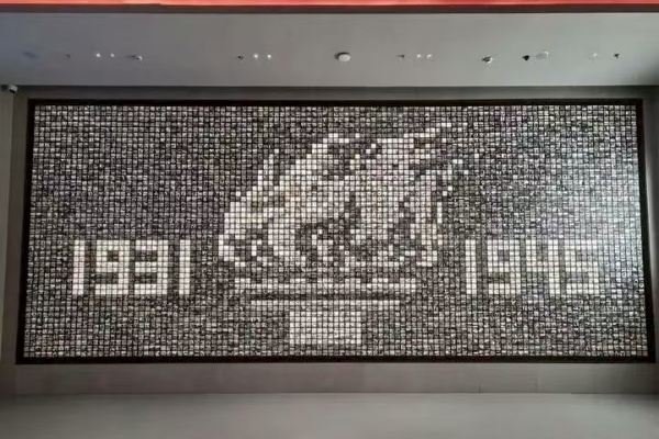 中国人民抗日战争纪念馆,5098张照片组成的巨型照片墙,展现了中国人民从1931年9月18日到1945年9月2日5098天浴血抗战的历史。(来源:央视新闻)