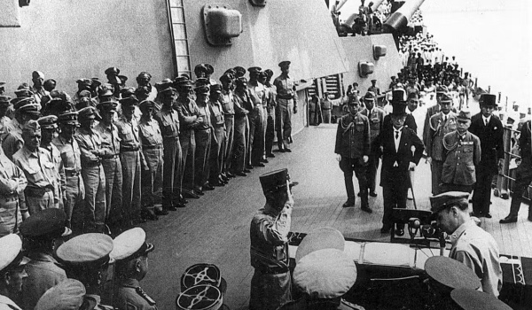 资料照片:1945年9月2日,日本向盟军投降仪式在东京湾密苏里号军舰上举行。新华社发