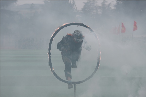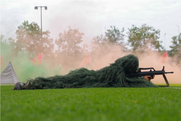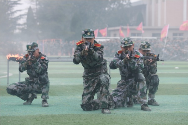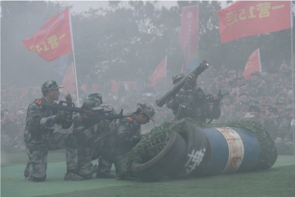 战术表演中,同学们运用战术队形进行作战演练,在模拟战场环境下进行接敌运动、搏斗杀敌、夺取阵地,将军训成果汇报表演推向高潮,充分展示了同学们良好的综合素质和朝气蓬勃、积极向上的精神风貌。