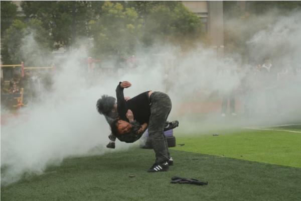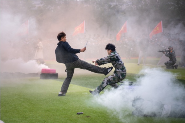 在军事科目表演环节,气势雄壮的刺杀操、刚劲有力的军体拳、英姿飒爽的匕首操、处置果断的校园反恐演练,一招一式尽显斗志昂扬,赢得全场师生的阵阵掌声。