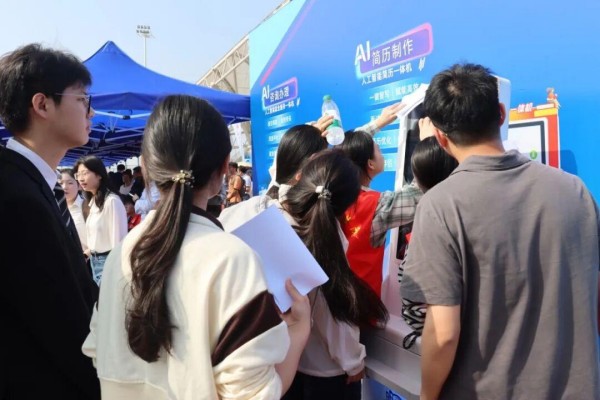 备受追捧的AI就业赋能区格外火爆,人工智能简历一体机前学生排起长长队伍,大家有序等候、依次操作。设备一键完成简历排版优化、格式校正、高清快速打印,轻松解决毕业生现场简历不完善、打印不及时、排版不规范等难题,高效助力学子备好精致简历,从容奔赴面试对接。便捷智能、高效省心的服务体验,收获在场师生一致好评。