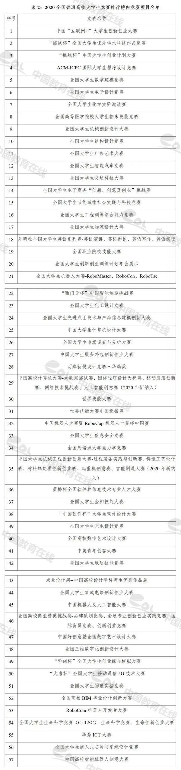 2021年3月9日,全国高校竞赛评估与管理体系研究专家委员会会议在杭州召开。会上采取无记名投票方式,新增13项竞赛纳入2020全国普通高校大学生竞赛排行榜(榜单内已有竞赛的子赛纳入但不计算竞赛项目数)。纳入排行榜的全部竞赛项目共57项,详情如下: