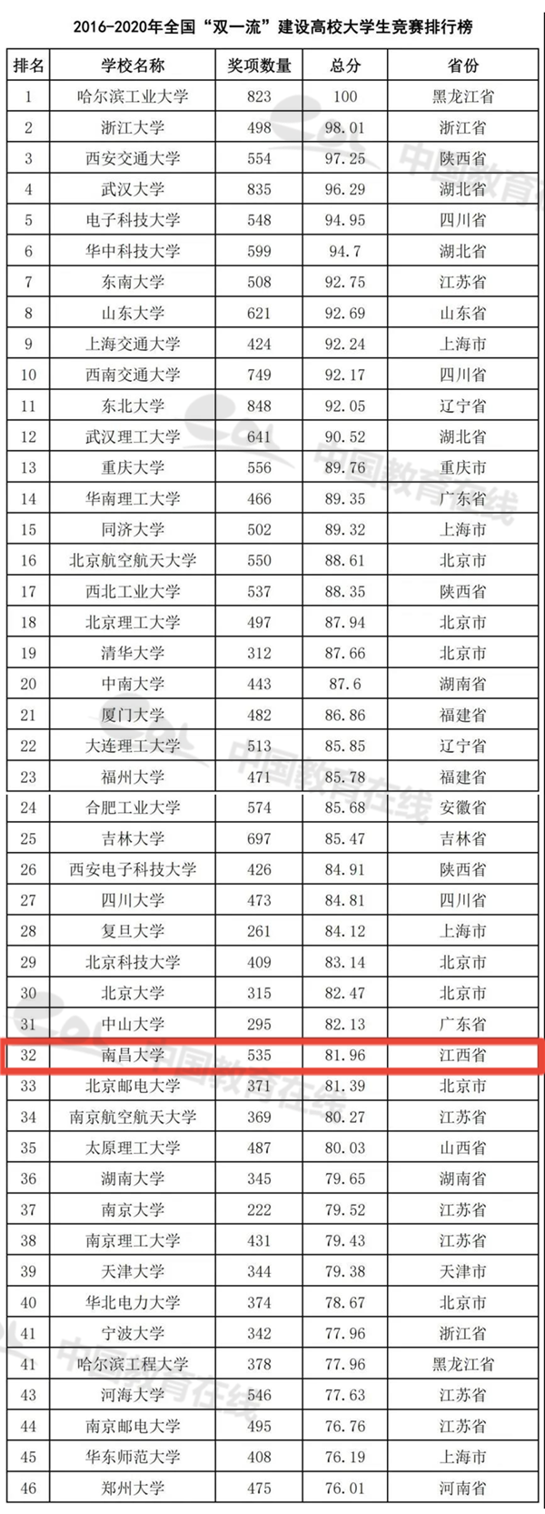 中国教育在线讯 3月22日,中国高等教育学会高校竞赛评估与管理体系研究工作组发布2020全国普通高校大学生竞赛排行榜,其中包含本科院校榜单13个、高职院校榜单10个、省份榜单3个。南昌大学在2016-2020年全国地方本科院校大学生竞赛排行榜列第4位,2016-2020全国综合类本科院校大学生竞赛排行榜列第11位,2020年全国普通高校大学生竞赛排行榜(本科)列第14位,2016-2020年全国”双一流“建设高校大学生竞赛排行榜列第32位,2016-2020年全国普通高校大学生竞赛排行榜(本科)列第34位,全国普通高校大学生竞赛排行榜五轮总排行榜列第43位。