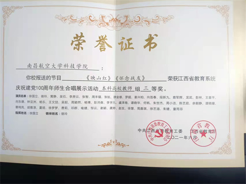 近日,江西省委教育工委、江西省教育厅公布了全省教育系统庆祝建党100周年师生合唱展示活动获奖名单,昌航科院报送的《映山红》和《怀念战友》等两个节目,荣获本科高校教师组三等奖。
