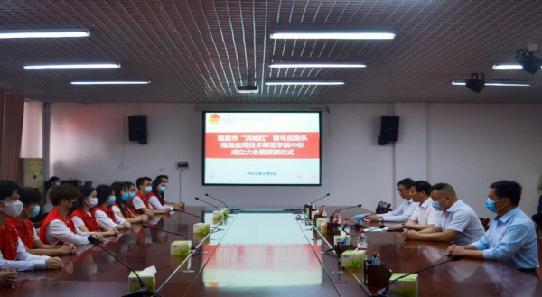 为进一步巩固全域全面动态清零成果,提高全市疫情应急处置能力,全力支持全市疫情防控工作,提升我校疫情防控科学化、规范化水平,切实保障校园师生健康安全,2022年5月6日上午,南昌应用技术师范学院根据团市委指示,在行政楼第二会议室举行南昌市“洪城红”青年应急队南昌应用技术师范学院中队成立大会暨授旗仪式。校领导陈宇、崔晨、陶其辉、郭宇出席成立大会和授旗仪式。校党委副书记崔晨为应急队伍授旗,校长陈宇讲话,校长助理郭宇主持会议和仪式。