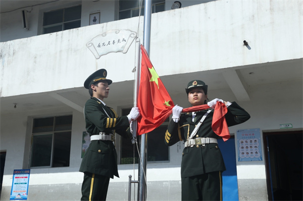 来自国旗护卫队的志愿者还到水江小学教同学们站军姿、踢正步,进行升旗仪式。烈日炎炎下,小朋友目光炯炯,注视着上升的五星红旗,脸上满是对美丽祖国的敬畏与憧憬。随后,实践团队员贺超做了国旗下讲话,向小朋友们讲授了一段共青团发展史的团课,小朋友们听得津津有味。“虽然小学的条件很简陋,但是能让小朋友们看到我们穿着正式的军礼服进行升旗仪式,我想一定会在他们心中种下一颗种子。希望通过我们这一次的升旗仪式,能让小朋友们对国旗更加敬畏,也对我们的国家感到更加的自豪。”队员王晶晶说道。