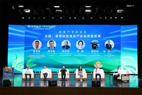 徐斌主持产学研沙龙环节。万年贡集团董事长蔡阳厚、江中食疗科技有限公司董事长钟虹光、浙江九阳公益基金会经理刘璐、广丰中学校长周守勤、江西省食育学会副会长夏克坚围绕校企合作模式创新、食育课程体系共建等话题展开热烈讨论。