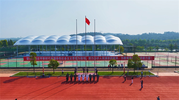 朝阳初升,晨光为田径场镀上温暖的金色。上午九时,伴随着雄壮嘹亮的国歌,五星红旗冉冉升起,全体人员肃立注目、齐声高唱,开学典礼在庄严的氛围中正式开启。