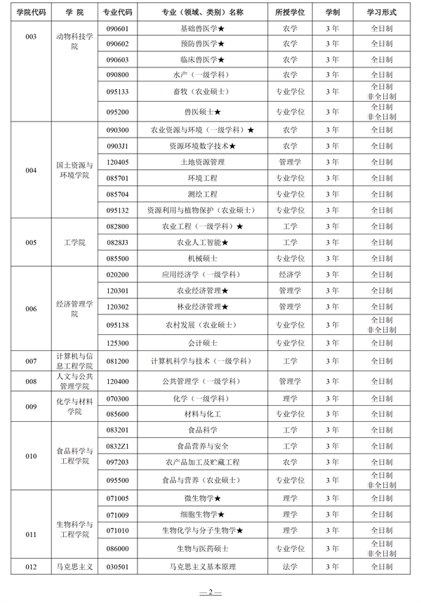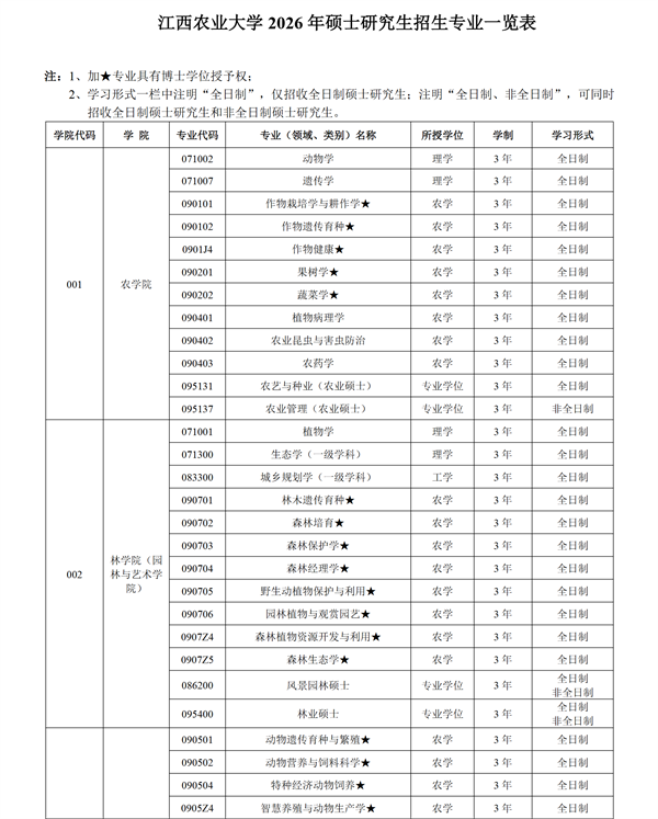 我校硕士研究生按其学习方式分为全日制硕士研究生和非全日制硕士研究生,具体招生学科及领域详见《江西农业大学2026年学术型硕士研究生招生专业目录》及《江西农业大学2026年专业学位硕士研究生招生专业目录》。2025年我校招生人数1537人,2026年硕士生招生人数以教育部下达招生计划为准。各招生学院所列招生人数为预计招生人数,实际招生人数将以当年国家实际下达规模、学校接收推免生实际人数和学校实际招生计划分配情况为准。