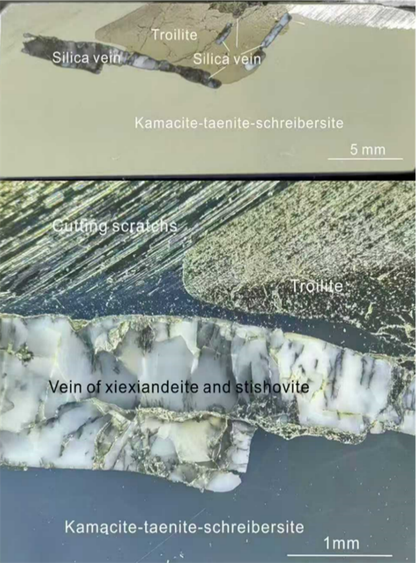 图2铁纹石-镍纹石-陨磷铁矿和陨硫铁中的谢石英和斯石英的脉体