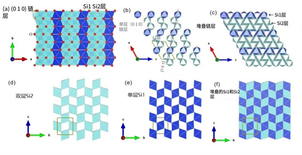 图4谢石英的晶体结构(结构数据来源于Teter等,1998)是使用免费软件VESTA(Momma和Izumi,2011)绘制而成。(a)沿c轴观察,(b)(c)沿b轴观察,以及(d)(e)(f)沿a轴观察。(b)显示在(010)面网上sio6八面体沿[101]方向共棱连接构成折状链的排列情况。(c)显示sio6八面体链通过交替c/2平移堆叠。(a)(d)(e)中,交替平移的sio6八面体链通过角链共角顶连接形成平行于(100)方向的八面体单层(分别称si1和si2)。(f)显示si1和si2沿a轴方向交替c/2平移堆叠。