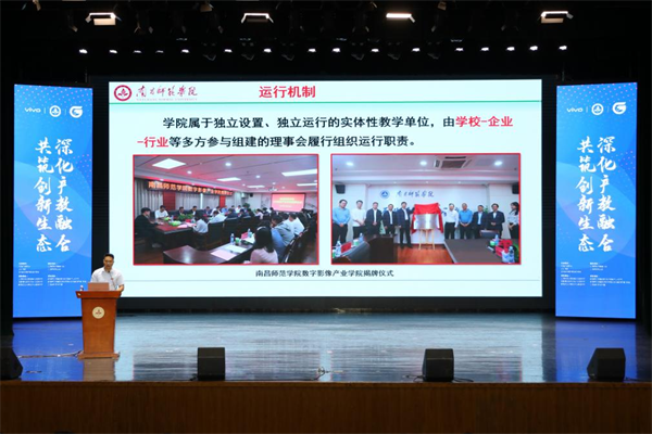 南昌师范学院党委书记王金平致辞。他简要介绍了学校的基本情况,特别是学校在数字影像人才培养、产教融合与服务区域发展方面的积极探索以及取得的成效。他指出,数智影像已成为推动数字经济与文化创意深度融合的关键领域,此次与vivo江西分公司的合作,是打破“校墙”与“厂门”界限、推动产学研用深度融合的重要实践。王金平提出,校企双方应围绕需求导向、技术协同、文化赋能、长效机制四个方面深化合作,共同打造人才培养新高地、产研转化新平台和具有赣鄱特色的文化IP。