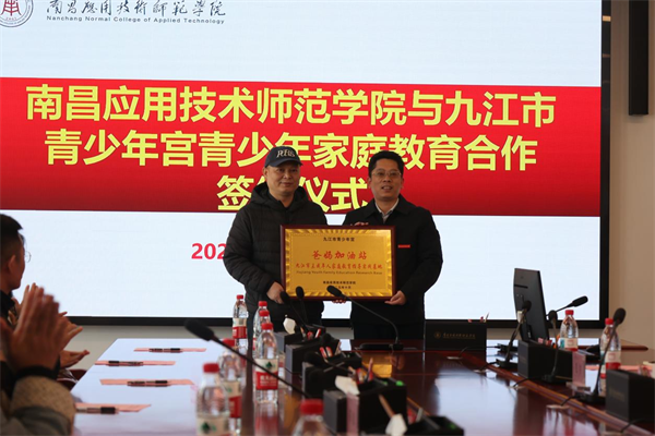 在与会领导和嘉宾见证下,双方签署《家庭教育合作协议》。郑行忠代表南昌应用技术师范学院向九江市青少年宫授予“爸妈加油站——九江市未成年人家庭教育指导实践基地”牌匾,霍彪代表九江市青少年宫向南昌应用技术师范学院授予“九江市青少年家庭教育研究基地”牌匾。霍彪还为首批“第二课堂家庭教育导师”代表颁发聘书。