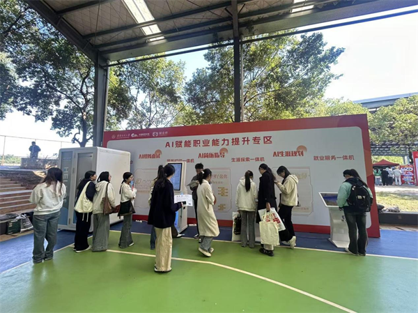 招聘会现场气氛热烈高涨,除了优质企业展位前的火爆咨询场景,由中国教育在线·就业桥提供的四台AI智能就业服务设备组成的“AI赋能职业能力提升专区”同样成为焦点。