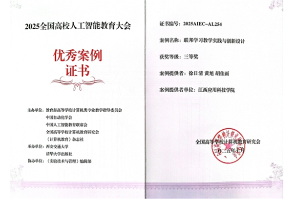 近日,2025全国高校人工智能教育大会(AIEC2025)在西安召开。江西应用科技学院未来技术学院徐日清、黄旭、胡佳雨等联合提交的《联邦学习教学实践与创新设计》荣获优秀教学案例三等奖。此次获奖,不仅是上级部门对学校教学改革成果的充分肯定,更是学校在推动“人工智能+教育”战略落地、形成前瞻布局与成功实践的关键成果。
