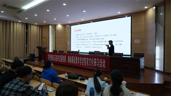 28日晚,在赣南师范大学文学与新闻传播学院召开的“深入理解中国发展经验,深化两岸青年交流互鉴”学术研讨会将此次研习活动推向高潮。研讨会以赣州市章贡区水南街道五指峰社区党总支书记尹国珠的《以组织建设为纲,绘就社区治理与融合新图景》主旨报告作为开场,为两岸学者串联起“客家精神与乡村振兴的契合性”“赣南苏区党建引领基层治理创新”等交流议题,深入探讨了客家文化、红色文化等资源赋能赣南苏区振兴发展的理论与实践议题。