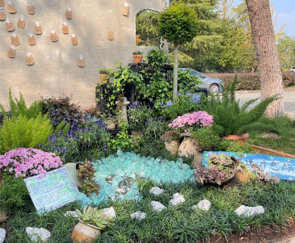 在展览现场,8组作品各有巧思,成为校园里一道独特的“生态风景线”。其中,以“都市疗愈”为主题的作品《陶语森境,疗愈绿洲》,参考英国自然式风景画的风格,通过兰花鼠尾草、孟娜薰衣草、蓝雪花等疗愈植物搭配浅色系陶罐,营造出静谧舒缓的氛围,模拟都市人在快节奏生活中渴望的“疗愈角落”。