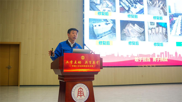 讲座中,刘辉围绕“以创新淬炼新时代劳模工匠精神”这一主题,从“劳动创造幸福、我的工匠精神、我的工匠情怀”三个方面讲述了自己从普通工人成长为大国工匠的点滴故事,将“爱岗敬业、争创一流”的劳模精神和“精益求精、追求卓越”的工匠精神传递给在场的每一位师生。他强调,劳动是实现个人价值与社会进步的桥梁,只有将个人理想融入国家发展,才能真正让幸福的源泉奔涌不息。近两个小时的讲座,他全程站立,以实际行动展现了劳模的敬业风范和职业素养,赢得了师生们的由衷敬佩。