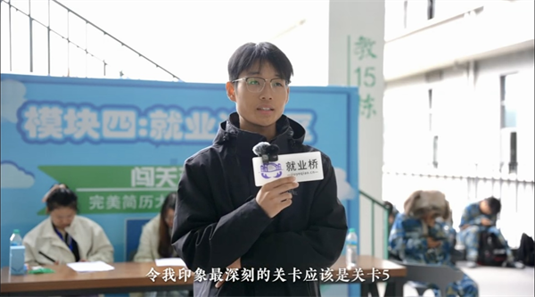 “模块4的集体夹积木垒高塔挑战让我印象特别深!”学生曾荣林分享道,“这个挑战不仅考验团队协作能力,还让我们完整体验了求职全流程——从简历投递到现场面试,尤其是加入了AI智能面试环节,帮我精准找到了自己的提升空间,收获特别大。”