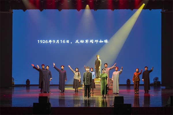 第二篇章《薪火相传·使命担当》,通过原创红色故事《赣鄱大地巾帼红·马前托孤李美群》、南昌清音《傲雪红梅》、原创红色故事《江河不醒,侬志长存——赵醒侬故事》、舞蹈《那一片红》等节目的表演,引导广大师生从李美群的“舍亲”之爱,到梅汝璈的争锋之智,再到赵醒侬的“醒民”之志,认识到“担当”从来不是抽象的概念,它关乎亲情、职责与信仰,在每一个历史关头,被赋予具体而崇高的模样。