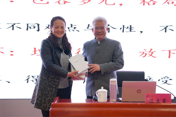 谈及“趣味人生”与“思想人生”,汪立夏分享了自己在摄影、古琴、书法、香道等兴趣爱好中的感悟,倡导“工作生活化,生活艺术化”的生活态度。他认为,趣味是心灵的养分,能让生活更具质感。他勉励学子培养至少一项长期坚持的兴趣,无论是读书、运动还是艺术创作,让热爱成为调节生活的润滑剂,在沉浸式投入中涵养情趣、提升生活质感。同时,思想的深度决定人生的高度,通过研读经典、浸润文化,方能涵养情趣、提升品位,实现“快乐工作,诗意生活”的理想状态。