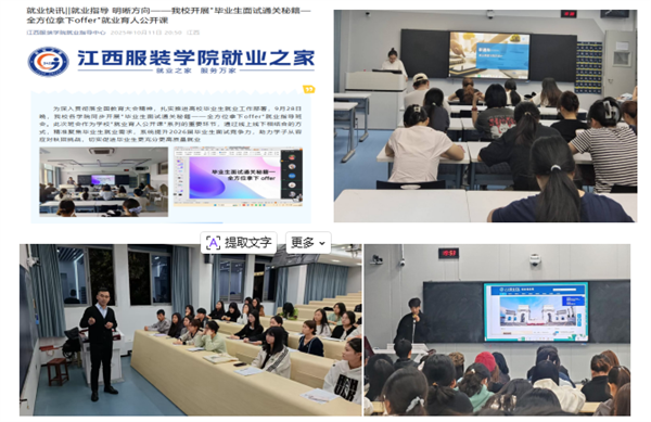 在拓展岗位的同时,江西服装学院持续强化就业指导服务。早在7月份就面向2026届毕业生开展就业技能系列培训。秋季学期以来,该校就业处系统推出“就业育人公开课”主题班会,围绕简历撰写、面试礼仪、职业规划等内容开展精准指导,助力毕业生提升就业综合竞争力,赢得职场主动。