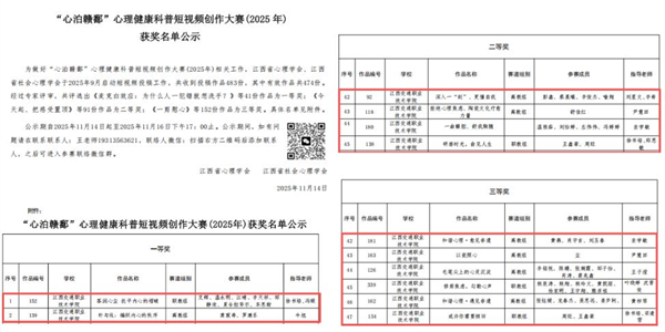 近日,江西交通职业技术学院心理健康教育工作喜讯连连,师生在两项省级评选与赛事中斩获多项荣誉。在江西省高校心理健康教育专业委员会公布的2025年评选结果中,教师贾炜荣获评全省“大学生心理健康教育优秀工作者”,教师张春兰、童年分别撰写的学术论文与工作案例获优秀奖。在江西省社会心理学会主办的2025年“心泊赣鄱”心理健康科普短视频创作大赛中,学院师生团队获一等奖2项、二等奖4项、三等奖6项。
