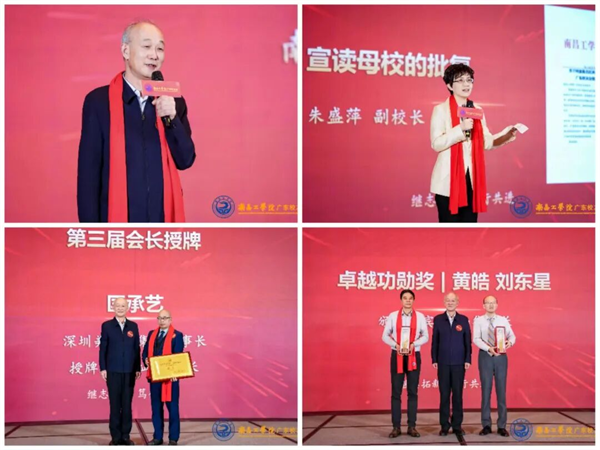 换届大会上,康灿华校长充分肯定广东校友会第一,第二届理事会取得的工作成绩,称赞其已成为母校在粤港澳大湾区的一张亮丽名片。他强调,校友会应紧抓人工智能与粤港澳大湾区发展双重机遇,持续深化与高校校友联合平台的跨校资源协作,积极推动校友企业与母校在学科建设、科研创新等方面深度融合,努力实现“南工智慧”与“湾区机遇”的双向奔赴。朱盛萍副校长现场宣读第三届理事会任职批复,康灿华校长为新任会长匡承艺授牌,并为荣誉会长黄皓、刘东星颁奖,顺利完成新老交接。