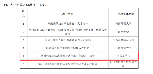 近日,《江西文化艺术基金2025年度(一般项目)立项名单》揭晓,南昌工学院申报的《新时代江西漆艺髹饰技艺传承与创新人才培养》成功入选,喜获立项。