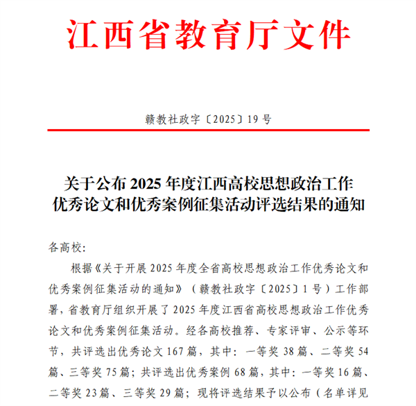 此次在2025年度江西高校思想政治工作优秀论文和优秀案例评选中荣获佳绩,既是对学校思政育人实践成效的有力印证,也为我们今后的工作注入了新的动力。学校将始终坚守“立德树人”初心,持续推动特色思政课内涵式发展,着力提升思想政治教育的时代性、针对性与亲和力,矢志培养兼具责任担当、创新精神与人文素养的新时代青年,为服务国家战略需求和民族复兴伟业贡献更坚实的教育力量。(来源:南昌应用技术师范学院; 作者:周其珍)