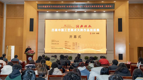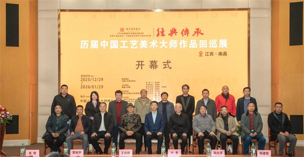 岁聿云暮,万象涵光。12月29日下午,国家艺术基金资助项目“经典传承——历届中国工艺美术大师作品回巡展”收官之战,于南昌工学院华彩启幕。本次展览由中国工艺美术学会指导,南昌工学院主办,中国工艺美术大师博物馆承办,江西省工艺美术学会、南昌应用技术师范学院共襄学术支撑。赣鄱南昌,既为巡展肇始之地,亦作万里行程终篇之笔。八站辗转,一载春秋,跨越山河,终归原乡。中国文艺评论家协会副主席、江西省政协教科文卫委副主任、江西省文联原主席叶青,中国城市雕塑家协会副主席、江西省美术家协会原主席王向阳,南昌应用技术师范学院校长陶也青,江西工艺美术馆馆长雷铭宇,江西省工艺美术学会理事长、中国工艺美术大师熊建新,江西师范大学美术馆馆长苏敉,江西水利电力大学人文与艺术学院院长万芬芬,豫章师范学院美术学院院长程凌云,江西科技师范大学传统工艺研究院院长寇焱,中国轻工业陶瓷研究所副所长涂志浩,中国工艺美术大师孙燕明等,携手赣地工艺美术界同仁及学校师生代表,共聚一堂,见证这场流动的文化盛典。