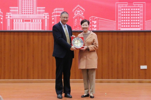 刘耀彬代表学校向林郑月娥赠送了纪念品。香港籍学生代表向林郑月娥献花。