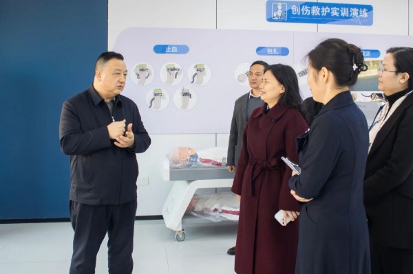 汪玉贵一行实地了解了基地建设、校园应急培训及校地协同工作开展情况,详细查看急救培训场地、实操教学设备及AED布设点位,听取了学院关于急救基地运行、学生应急救护培训、防溺水与海姆立克急救法教学、常态化应急演练等情况介绍,对学院将急救技能纳入学生综合素质培养、打造沉浸式生命教育模式的实践成效给予高度评价。