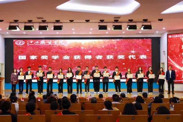 校党委副书记唐新强和校长助理尹娜娜为国家奖学金获奖代表颁奖