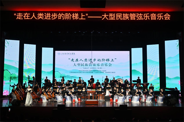 4月18日晚,由南昌市委宣传部、江西应用科技学院主办,该校音乐学院、辰林民族管弦乐团承办的“走在人类进步的阶梯上”大型民族管弦乐音乐会在音乐厅举行。作为2026年南昌市全民阅读周系列活动之一,本场音乐会也是该校“乐润心灵”之经典国乐第17期。音乐会立足阅读推广与美育实践相融合,以民族管弦乐为载体,生动呈现学校在文化育人、美育浸润和思政实践中的探索成效。各界嘉宾与师生代表齐聚一堂,在书香与乐声的交融中,共同感受阅读之美、文化之美与艺术之美。