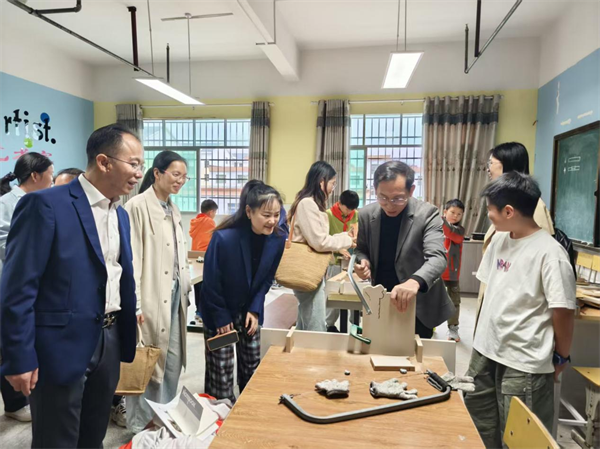 随后,在海尔希望小学师生的引导下,参观团实地走访了科创教育核心阵地。在科创室,学生自主设计的智能喷灌装置、气象站等作品展现了扎实的实践能力;航模航海展区内,各式水空模型整齐排列,部分模型曾获省级航模锦标赛一等奖;遥控足球赛道上,学生操控机器人进行攻防演练,展现编程与运动的融合创新;编程教室内,低年级学生通过图形化编程制作动画故事,高年级学生则在Python项目中开发实用小程序;3D打印与激光光刻区,个性化钥匙扣等创意作品彰显学生无限想象力;水火箭发射演示区,师生现场展示了“水与气压”原理的趣味应用;智慧农场里,无土栽培的蔬菜长势喜人,学生通过物联网设备实时监测温湿度;鲁班工坊将传统榫卯工艺与现代设计结合,学生制作的鲁班锁、桥梁模型兼具文化与科技韵味;电脑绘画展区,一幅幅充满科幻色彩的数字画作,呈现了学生对未来世界的奇思妙想。