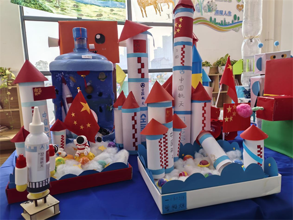 各年级围绕主题开展特色筹备活动。一二年级学生化身“环保小创客”,用纸箱、瓶盖等废旧材料打造简易机器人、火箭模型等科技小作品;三四年级学生聚焦身边科技产品,通过图文结合的方式完成调查报告,细致记录智能手表、扫地机器人等产品的功能与价值;五六年级学子则以“大国重器·手绘守护”为主题,查阅权威资料精准绘制航母、隐形战机等国防科技成果,标注关键技术参数与国防意义,尽显家国情怀与科学素养。这些作品在活动当天于校园门厅分区展出,成为一道亮眼的科技风景线。