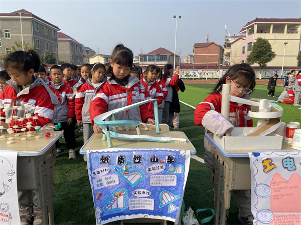 活动当天,现场赛事精彩纷呈,不同年级按时段有序开展个人赛与团体赛。一二年级的小选手们在篮球场参与纸杯叠叠乐、纸飞机精准投靶、静电小猫钓鱼等趣味挑战,在欢声笑语中感受科学原理的奇妙;“环保积木城”“吸管穹顶搭建”等团体项目,使低龄学子在协作中体验创造的乐趣。三至六年级的赛场同样热闹非凡,足球场与国旗广场上,“报纸城墙承重”“简易缆车制作”“太阳能小车竞速”“防灾小屋设计”等进阶项目轮番上演。学生们分组协作,从图纸设计到现场搭建,从原理探究到问题解决,充分展现了扎实的科学知识与出色的实践能力。