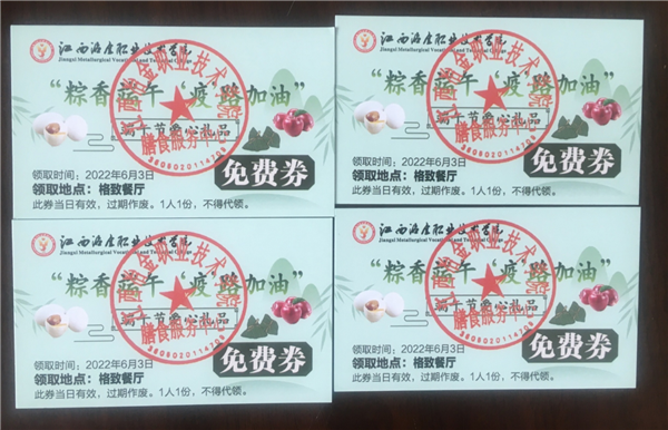 “浓情端午 ‘粽’情冶院”,本次活动是继清明节之后又一次“暖心”服务,学校在传统节日为在校学生提供传统美食,旨在进一步弘扬中华民族传统文化,为构建人文食堂、和谐校园营造浓厚的节庆氛围。(供稿:江西冶金职业技术学院 李利芳)