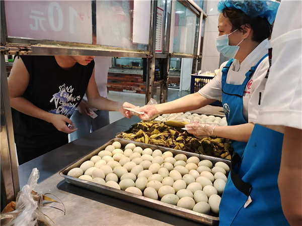为了让师生们吃上热乎乎的粽子,凌晨三点多各食堂就开始忙碌起来,一大早就准备好了粽子、咸鸭蛋和水果,在学生就餐时向其派送。每一个领到粽子的同学,脸上都洋溢着感动与愉悦的笑容。食堂里处处现温情,流露出笑容,流淌着感动。