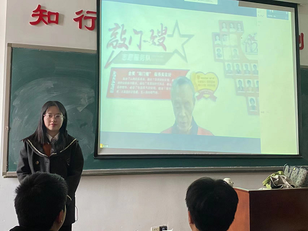 课堂上,邓老先生娓娓道来,讲述了含笑社区独居老人占比高的特殊性,以及敲门嫂队伍的由来。邓老先生与同学们分享了自己退休后从事敲门嫂志愿者工作的一些工作经历,呼吁新时代大学生关爱老人,弘扬尊老敬老爱老的传统美德。