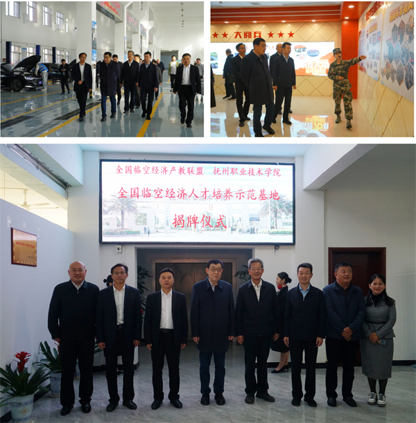 马培华一行先后走访参观了航空与旅游学院实训室、比亚迪汽车产业学院、非遗文化大师工作室、非遗文化物品馆藏室、国防教育馆,观看了戏曲班学生教学实训,并为全国临空经济人才培养示范基地揭牌。