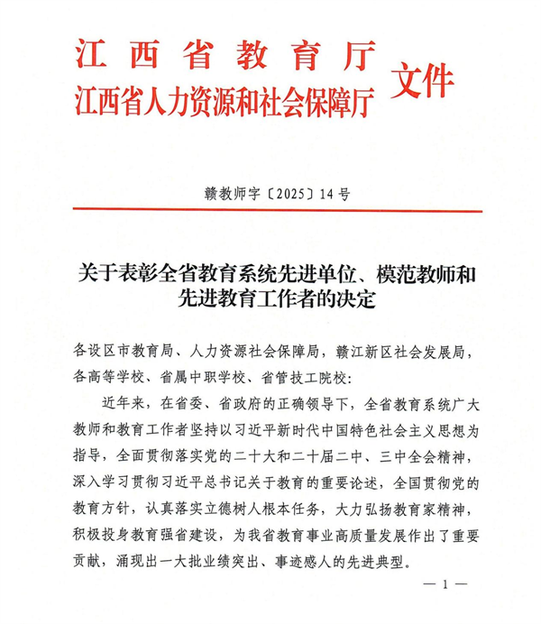 2025年9月4日,江西省教育厅、省人社厅联合发布表彰决定,江西工业贸易职业技术学院粮油食品系获评“全省教育系统先进集体”。