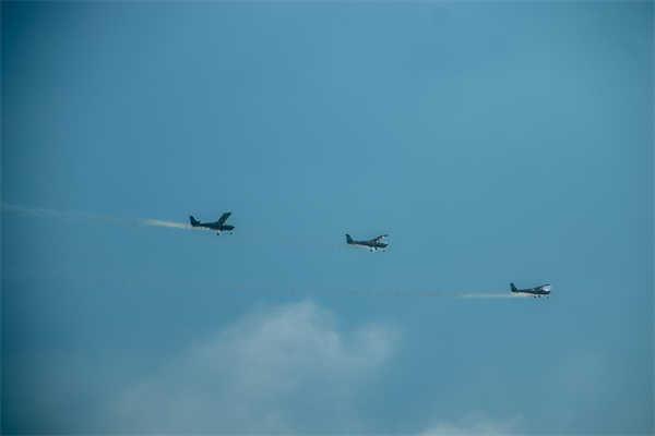 表演中,三架飞机配合默契,相继完成了多组精心设计的队形变换,并在蓝天背景下施放了绚丽的拉烟。飞机时而如利剑般刺破长空,时而如芭蕾舞者般优雅翩跹,用一道道凌空彩练,为地面观礼的全体师生呈现了一场震撼人心的视觉盛宴,现场欢呼与掌声此起彼伏。表演结束后,机队沿原定航线安全返航,顺利降落在抚州南城机场。